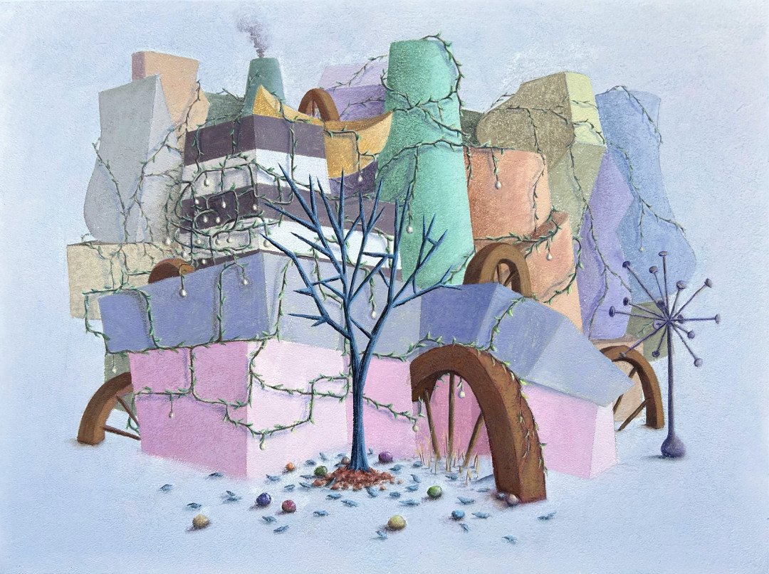 View fullsize   Tripod,  2022-26, acrylic and flashe on panel, 18”x24”